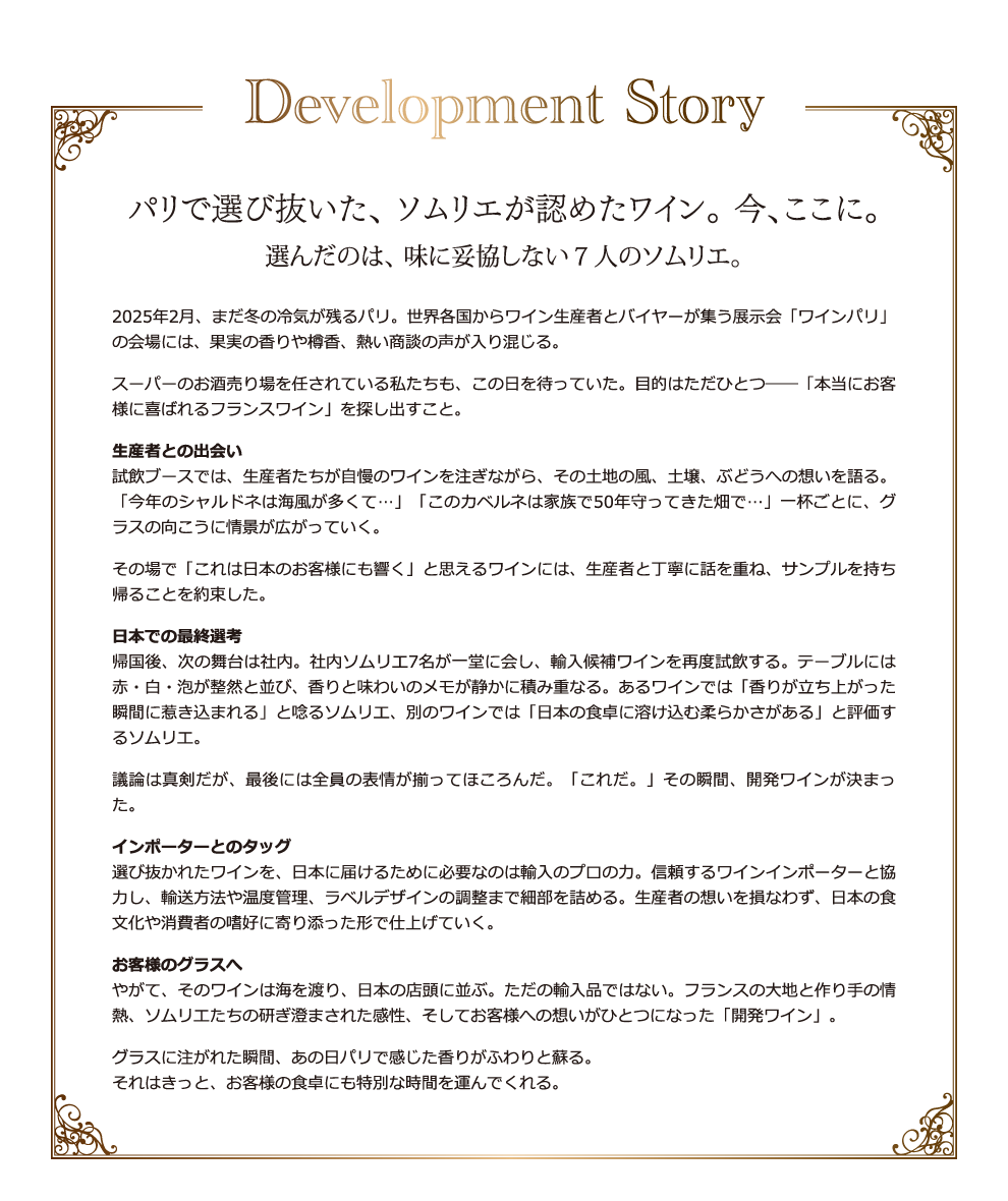 輝きのあるルビー色をしており、ダークチェリーややダークプラムなどの良く熟した黒い果実、黒蜜、クローヴなどのスパイスの香りが華やかに広がります。味わいは、しっかりとしたキメ細かいタンニンが全体を支え、豊かな果実味とともにふくよかで贅沢な印象を与えます。チキン、エッグココットなどと合わせると、料理との相乗効果でより一層楽しめる一本です。